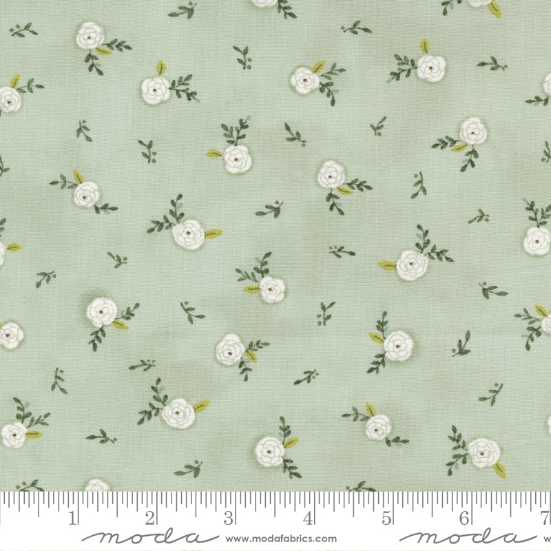 Happiness Blooms in FERN is a floral collection from Moda Fabrics. Pretty flowers of white on a light sage background, with little green leaves. Perfect for a main print or coordinating fabric.