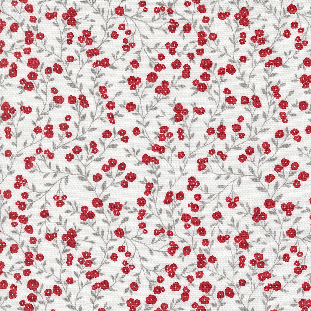 This print has an American meadow feel, scattered with red and white florals, vined in pale grey throughout.