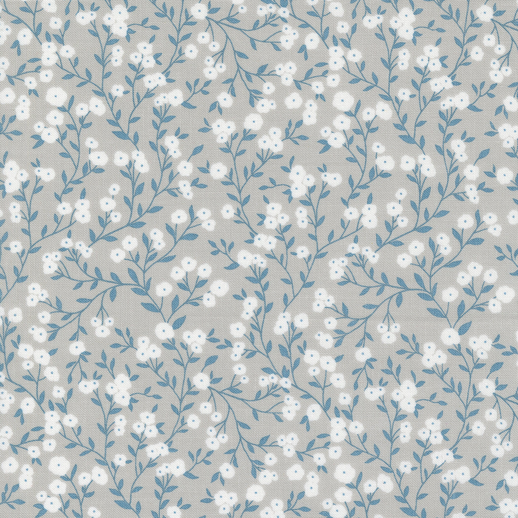 This print is a silver-themed meadow with white florals and blue vines on a grey background.