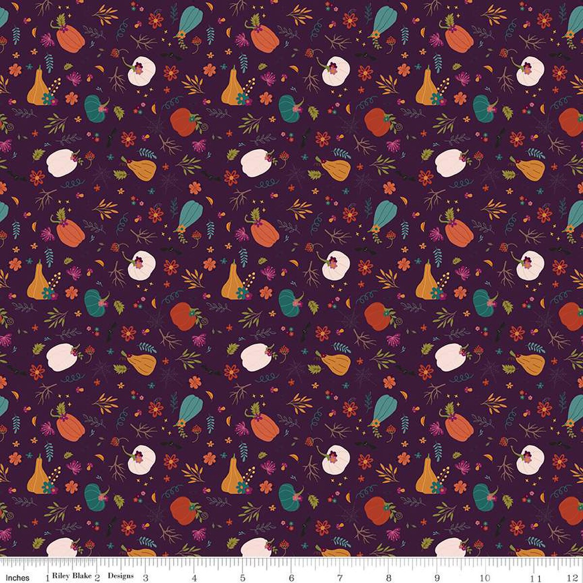 Jennifer Long's Little Witch Pumpkin Patch Purple for Riley Blake Designs is perfect for quilting, apparel, and home decor. This unique autumn print showcases a playful mix of pumpkins, leaves, flowers, and other whimsical elements.
