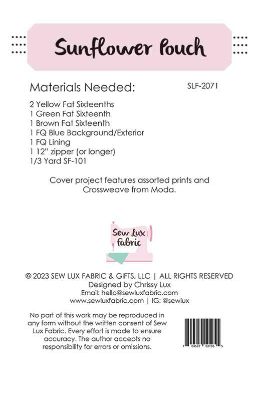 Create a charming fat-quarter-friendly Sunflower Pouch to store your favorite notions, pencils, or makeup. The possibilities are endless! Plus, its final size is a convenient 8" x 10".